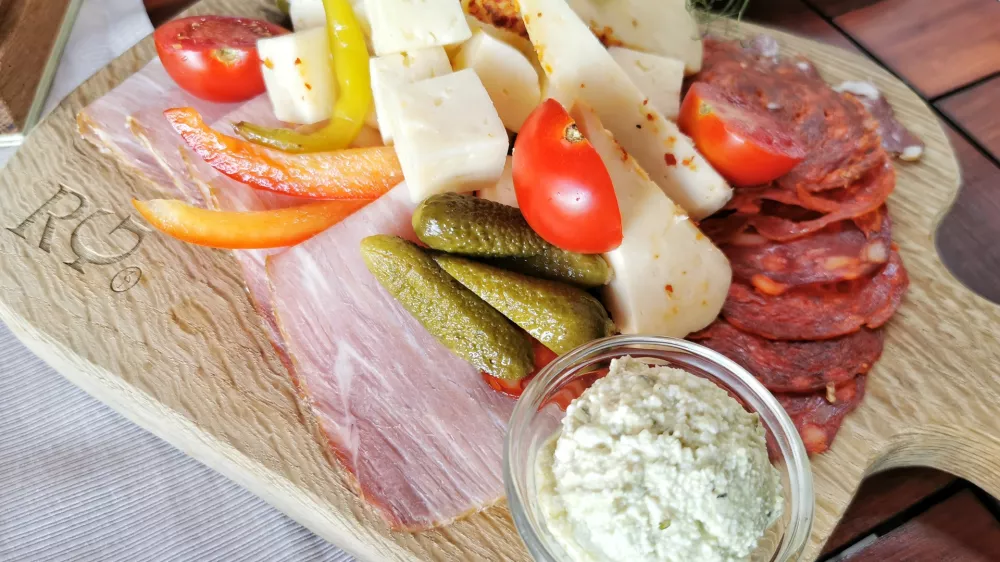 Uvod, ki so ga podprli radgonski mehurčki, je bil nedvoumen. Vzeli smo štajersko desko in tatarski biftek, imajo tudi primorsko ploščo, a nas tokrat ni zanimala. Pri štajerski deski je treba poudariti in pohvaliti pikantne kumarice, ki so spremljale feferone, paradižnike in predvsem sire, dva iz Pomurskih mlekarn, enega s kmetije v bližnjem Podgradu. V obilju je bilo tünke, savinjskega želodca in kulna, za tiste, ki so se hoteli že na začetku do konca najesti, pa tudi povsem bela zaseka in skuta z bučnim oljem. Morda velja omeniti, da je omenjen narezek, ki gotovo lahko nasiti vsak še tako lačen kvartet, ocenjen na presenetljivo prijaznih devet evrov.