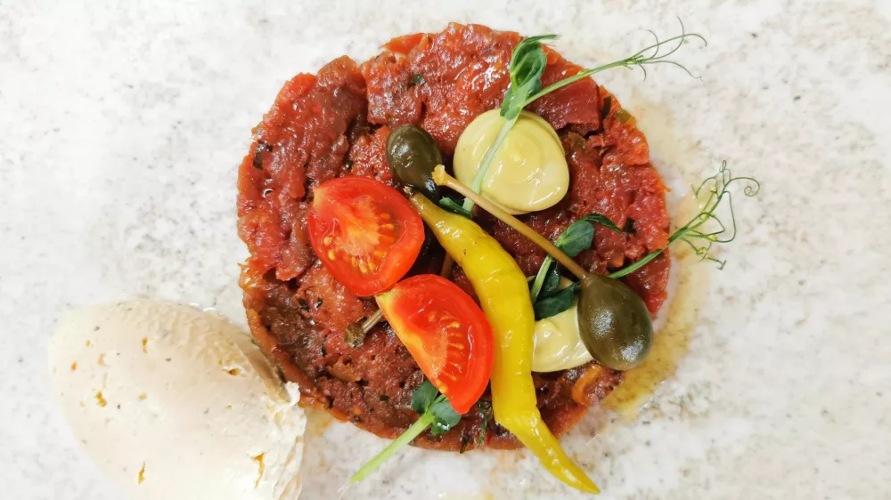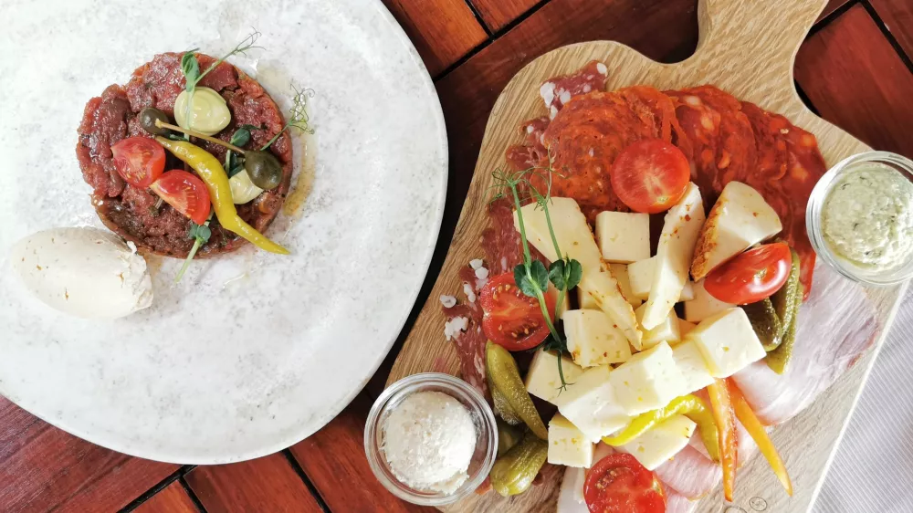 Le dva evra dražji je tatarski biftek, ki ga, mimogrede, natrgajo, ne meljejo. Za naš okus bi lahko bil še pikantnejši, a očitno takšnega ljubijo stalni gostje, ki, kot se zdi, radi pridejo tudi iz bližnje Avstrije. Tatarcu pridenejo stepeno začinjeno maslo, tu so še kapre, paradižnik, hišno olje in popečen kruh z bučnimi semeni. Porcija tega hladnega obroka je uradno namenjena eni, a je sposobna zadovoljiti dve lačni osebi.