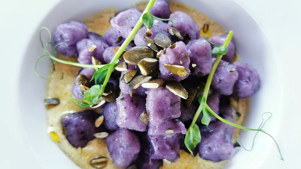 Konkreten vložek Radgonskih goric v gostinski projekt je očiten, a avtorji srebrne penine, enega najbolj prodajanih in prepoznavnih slovenskih produktov, imajo denar, ki ga je mogoče zaznati v mizah, stolih, priboru, zelenju na terasi in preostalem okrasju, tudi na straniščih. Konec koncev tudi v dejstvu, da so skoraj vsa vina, kakšnih 20 ali 30 jih je na karti, odprta na kozarec. Pred toplimi predjedmi smo se lotili polsuhe muškatne penine, njene veličastnejše in bolj suhe zlate sestre iz serije selection sans dosage v rosé različici, pa še, da vidimo, suhega svežega sauvignona, ki naj bi (nekoč) tekmoval tudi z najboljšimi štajerskimi vini sosednjih kleti. Vina so dobro sodelovala tako z veliko porcijo njokov iz vijoličastega krompirja s štajersko omako (bučna semena, bučno olje in smetana) kot s konkretno govejo juho, v katero zakuhajo korenje in simpatično zloženko palačink z jetrnim polnilom.