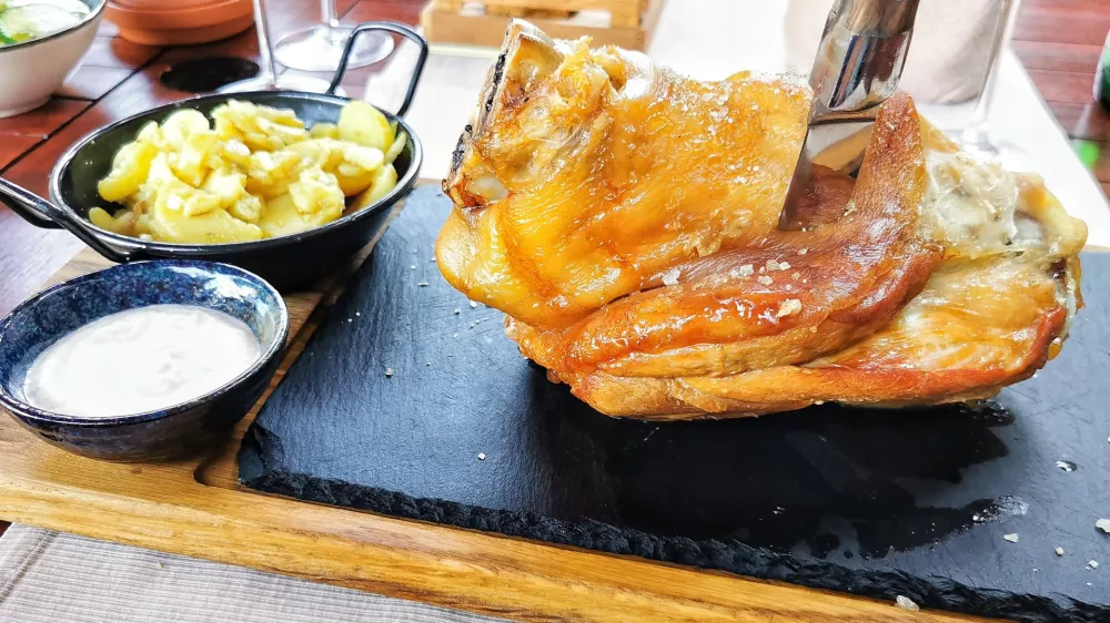 Rdečega vina iz svoje kleti tokrat niso imeli, modri pinot gre ves v penine, modra frankinja, novost v ponudbi, je že pošla. Na srečo je bila v pravi formi rdeča zvrst iz kleti Marof, da se je lahko pomerila z največjo svinjsko kračo za eno osebo, kar smo jih do zdaj srečali. Tudi če bi pečeno meso prednje nogice (17,5 evra) narezali in ponudili štirim osebam, se gotovo nihče ne bi pritoževal. Na zunaj je bila hrustljava, v notranjosti izredno mehka, spremstvo krompirjeve solate in smetane s hrenom pa ji je res dobro delo. Le malo manj je bilo solidnega fileja mignona s pirejem zelene, pečenim krompirjem in zelenjavo, še najmanj, a ne malo, pa svinjskih medaljonov, ki jih je spremljala najbolj štajerska priloga – stročji fižol s kislo smetano in ocvirki, dodatno pa je nastopala še majoneza z bučnim oljem.
