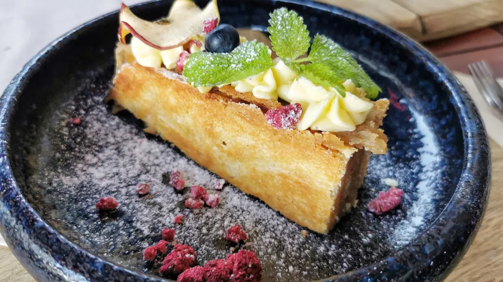 Morda je radodarnost do gostov, ki očitno radi obiskujejo lokal, povezana s promocijo radgonskih vin, a cene in velikost porcij v RG Bistroju enostavno niso ne po slovenskih ne po avstrijskih standardih. Še najbolj nedostopen je Steyerjev sladki traminec iz leta 2017 za osem evrov na kozarec. A za podporo izjemnim dišečim, z vinjakom flambiranim palačinkam z orehi (šest evrov) je bilo treba dobiti nekaj sladkega, le malo manj sladka, pa zato veliko obilnejša je bila jabolčna pita.