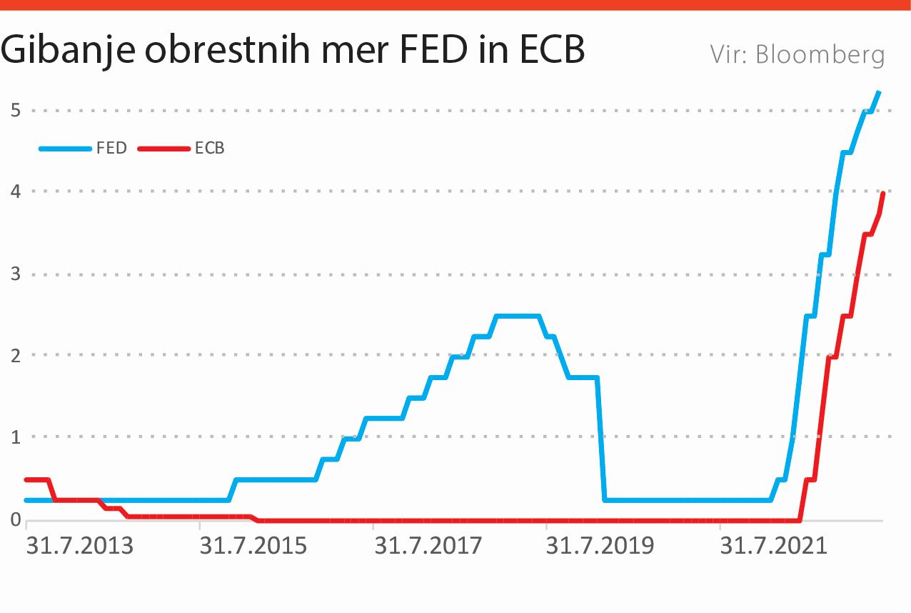Nekoliko drugačna je situacija v Evropi glede morebitne spremembe monetarne politike. Zaradi precej višje inflacije od ameriške ECB zaenkrat ne odstopa od poti dvigovanja. To je storila tudi pretekli četrtek z dvigom obrestne mere za 0,25 odstotka na štiri odstotke, kar je najvišje v zadnjih petnajstih letih. Predsednica ECB Christine Lagarde je napovedala dodatna zaostrovanja v naslednjih mesecih, razen če bi prišlo do pomembnih znižanj inflacijskih stopenj. Obenem je ECB znižala ocene gospodarske rasti, napovedala pa tudi nadaljnje zmanjšanje svoje bilance. Ne glede na dodatno zaostrovanje so tudi evropski delniški indeksi pridobivali. Ne gre prezreti dejstva, da so evropske delnice še zmeraj relativno gledano precej cenejše od ameriških.
