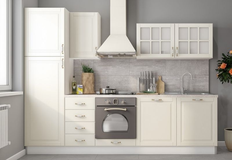 Kuhinja Evergreen bo s svojim brezčasnim dizajnom prinesla v vsak prostor toplino in eleganco. Dobavljiva je v koščeni barvi z retro ročaji, ki so pravi prodajni hit.