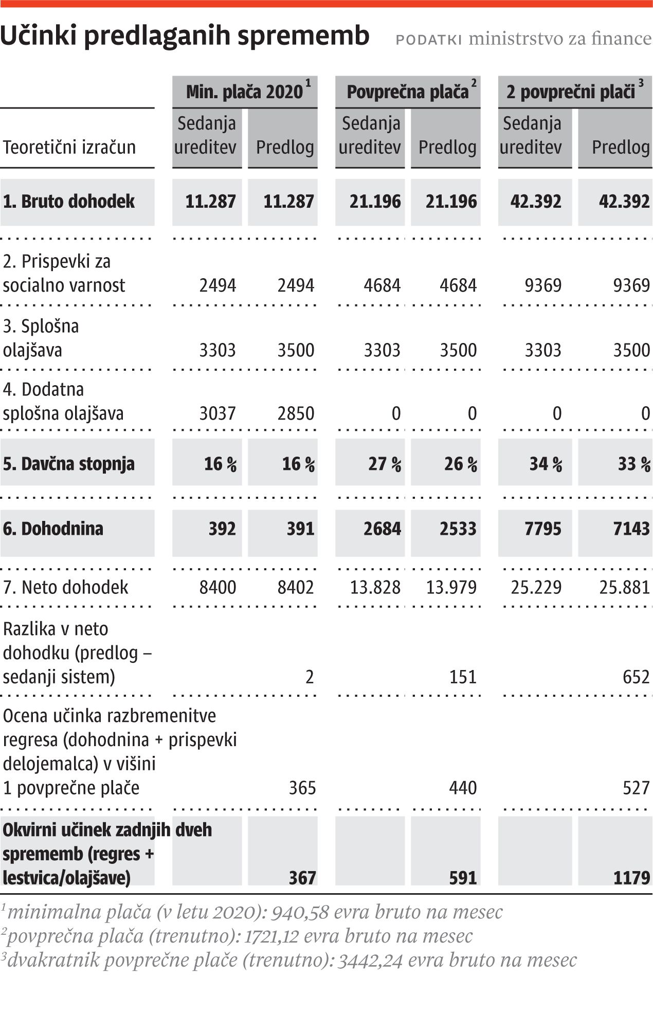 Po letošnji razbremenitvi regresa, ki je državo stala 90 milijonov evrov, so spremembe, ki jih je danes sprejela vlada, drugi korak v triletnem projektu davčne optimizacije. V njem so ključne spremembe dohodninske lestvice. Nekoliko se dvigajo meje za vstop v višje davčne razrede, hkrati pa se v drugem dohodninskem razredu davčna stopnja znižuje s 27 na 26 odstotkov, v tretjem davčnem razredu pa s 34 na 33 odstotkov. Splošna olajšava se bo povečala s sedanjih 3303 evrov na 3500 evrov, obenem bo uvedena linearna dodatna splošna olajšava za vse dohodke do letne višine 13.316 evrov. S tem naj bi preprečili, da bi naslednje leto, ko se minimalna plača zvišuje, najslabše plačani delavci ostali brez najvišje dodatne splošne olajšave.