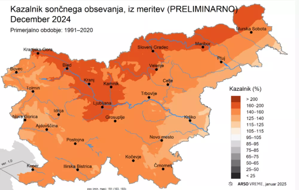 December 2024 je bil zelo osončen, s kazalnikom trajanja sončnega obsevanja na državni ravni je dosegel 151 odstotkov, kar ga uvršča med šest najbolj osončenih decembrov od leta 1961. Največ sončnih ur so zabeležili ob meji z Avstrijo in v Ljubljanski kotlini, najmanj pa vzdolž meje s Hrvaško.