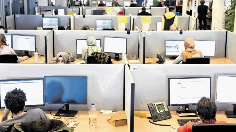 Mariborska enota centra za pomoč uporabnikom A1 deluje v drugem nadstropju nekdanjega hotela Slavija. Večina od približno 50 delovnih postaj v temačnem podolžnem prostoru je bila v sredo dopoldne nezasedena, vzdušje je bilo mirno, skorajda počitniško. Strop so krasile kartonske »uteži« z natisnjenimi kratkimi nasveti, kot sta »Pravilna uporaba vprašanj« ali »Zaključna zahvala in pozdrav«.