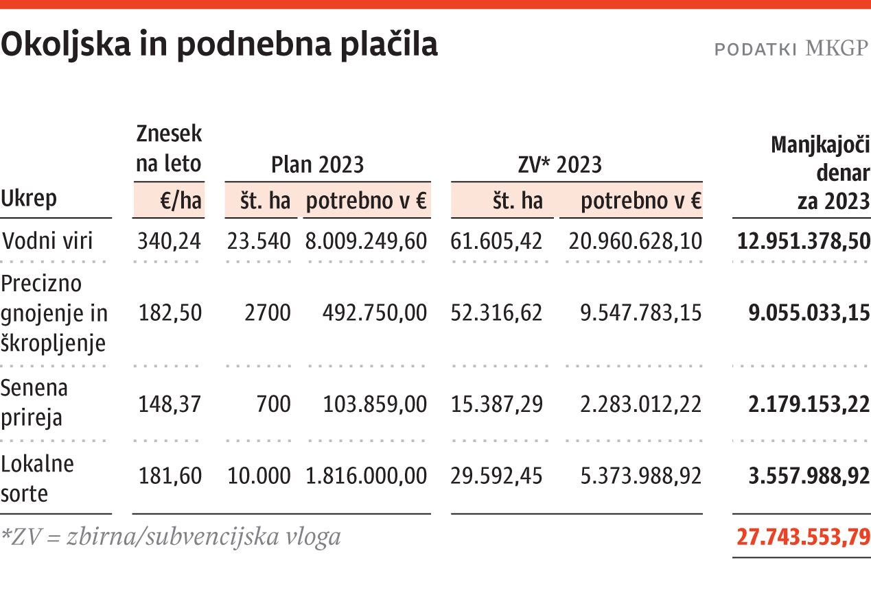 Iz dokumentov, ki smo jih pridobili, je mogoče razbrati, da so se na ministrstvu za kmetijstvo, gozdarstvo in prehrano (MKGP) pri nekaterih kmetijsko-okoljsko-podnebnih ukrepih (KOPOP), namenjenih spodbujanju sonaravnega kmetovanja, s katerim naj bi pred onesnaženjem varovali vode in tla ter zmanjšali negativne vplive kmetovanja na zrak, pošteno ušteli. Kmetje so se v te ukrepe vključili lani, subvencije zanje bodo prvič prejeli letos. Toda na MKGP za nekatere ukrepe niso znali niti približno oceniti, kolikšno bo zanimanje zanje, zato jim za izplačilo vseh samo letos manjka več kot 28 milijonov evrov. Namesto načrtovanih 29,4 milijona evrov potrebujejo skoraj 58 milijonov.