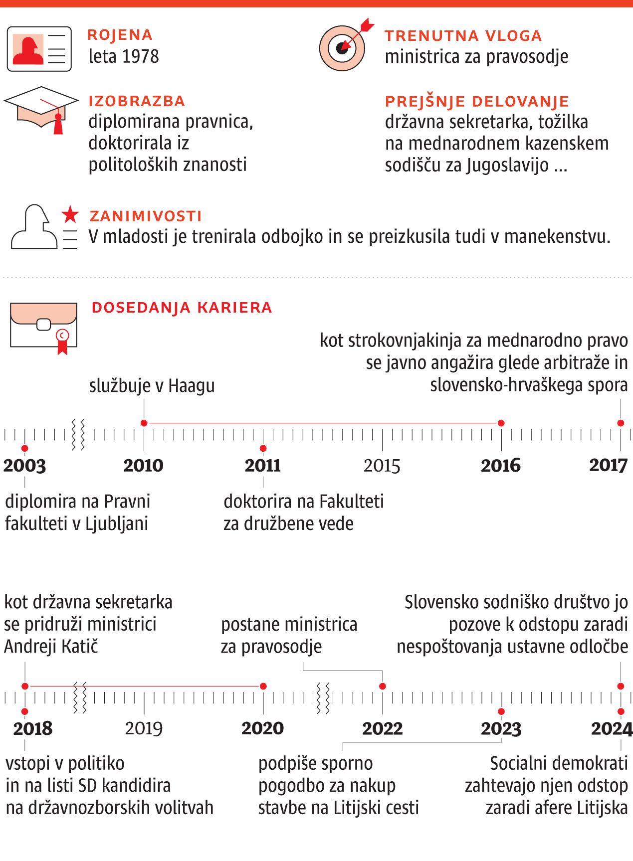 Politična kariera Dominike Švarc Pipan ni dolga, je pa zagotovo pestra. Diplomirana pravnica, ki je kasneje doktorirala na Fakulteti za družbene vede Univerze v Ljubljani, vmes pa študirala tudi na Londonski šoli za ekonomske in politične vede, se je v politiko namreč podala šele pred dobrimi šestimi leti. Pred tem je kot pravnica službovala v Haagu, kjer je bila tožilka na mednarodnem kazenskem sodišču za nekdanjo Jugoslavijo in mednarodnem rezidualnem mehanizmu za kazenska sodišča ter strokovna sodelavka na meddržavnem sodišču. Prav njeno poznavanje mednarodnega prava ji je utrlo pot v slovensko politiko, saj se je kot strokovnjakinja javno izpostavila v času boja za interpretacijo arbitražne razsodbe slovensko-hrvaškega mejnega spora. Njeni jasni in samozavestni nastopi niso ostali neopaženi, tudi njej pa je postajala ideja o selitvi v politiko vedno bližje. Interesentov za njen angažma naj bi bilo več, nazadnje pa se je pridružila Socialnim demokratom. Vodstvu stranke jo je tedaj priporočil Matjaž Nemec, ki se je v kabinetu predsednika vlade Boruta Pahorja, nato pa v poslanskih klopeh prav tako srečeval s slovensko-hrvaškim mejnim vprašanjem. Mednarodna politika je bila tudi področje, ki je Dominiko Švarc Pipan znotraj stranke sprva najbolj zanimalo, kasneje pa se je osredotočila predvsem na slovensko pravosodje.