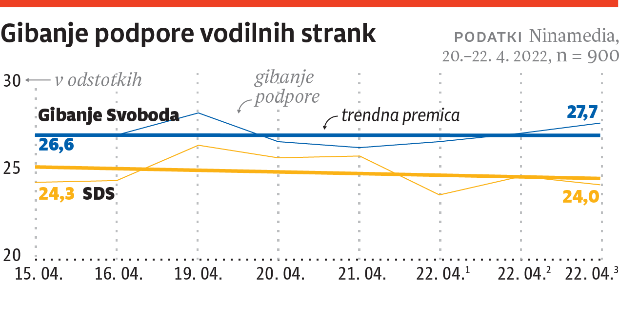 Čeprav stranka Roberta Goloba ohranja prednost pred Janezom Janšo (SDS) pri 3,7 odstotne točke, pa zaradi intervala zaupanja zmage GS na nedeljskih volitvah v tem trenutku ni mogoče razglasiti. Kajti maksimalni doseg SDS seže do 26,8 odstotka, minimalni doseg Gibanja Svobode pa do 24,8 odstotka in obratno: maksimalni doseg GS je dobrih 30 odstotkov, minimalni doseg SDS pa slabih 21,2 odstotka.