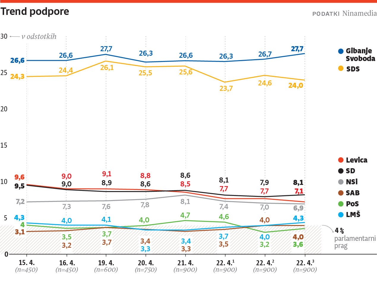 (Volilno napoved smo danes na spletni strani Dnevnik.si objavili trikrat; zjutraj smo objavili prvo, ob 11h drugo, tokrat pa objavljamo še tretjo. Zato so meritve na dan 22. 4. v tabeli in grafikah označene z zaporednimi številkami 1, 2 in 3.)