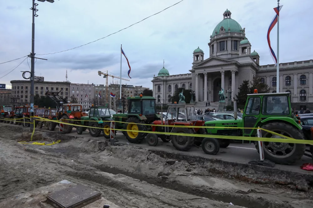 Današnji večer pa je v Beogradu zaznamovala drugačna atmosfera zaradi študentskih protiprotestnikov, ki od prejšnjega tedna taborijo v Pionirskem parku, zeleni površini med Palačo Srbije in Novim dvorom, kjer ima sedež predsednik republike. Danes zjutraj so se pojavili traktorji, ki so v dveh koncentričnih krogih obkrožili študentski tabor in posredno tudi dostop na Vučićev dvor. »Ti traktorji okoli našega predsednika so infrastrukturni čudež Vučićevih partijašev. Čez noč so se pojavili in prikladno zaščitili predsednika in njegove podanike,« nam je povedal Lazar Gerić, upokojeni arhitekt.