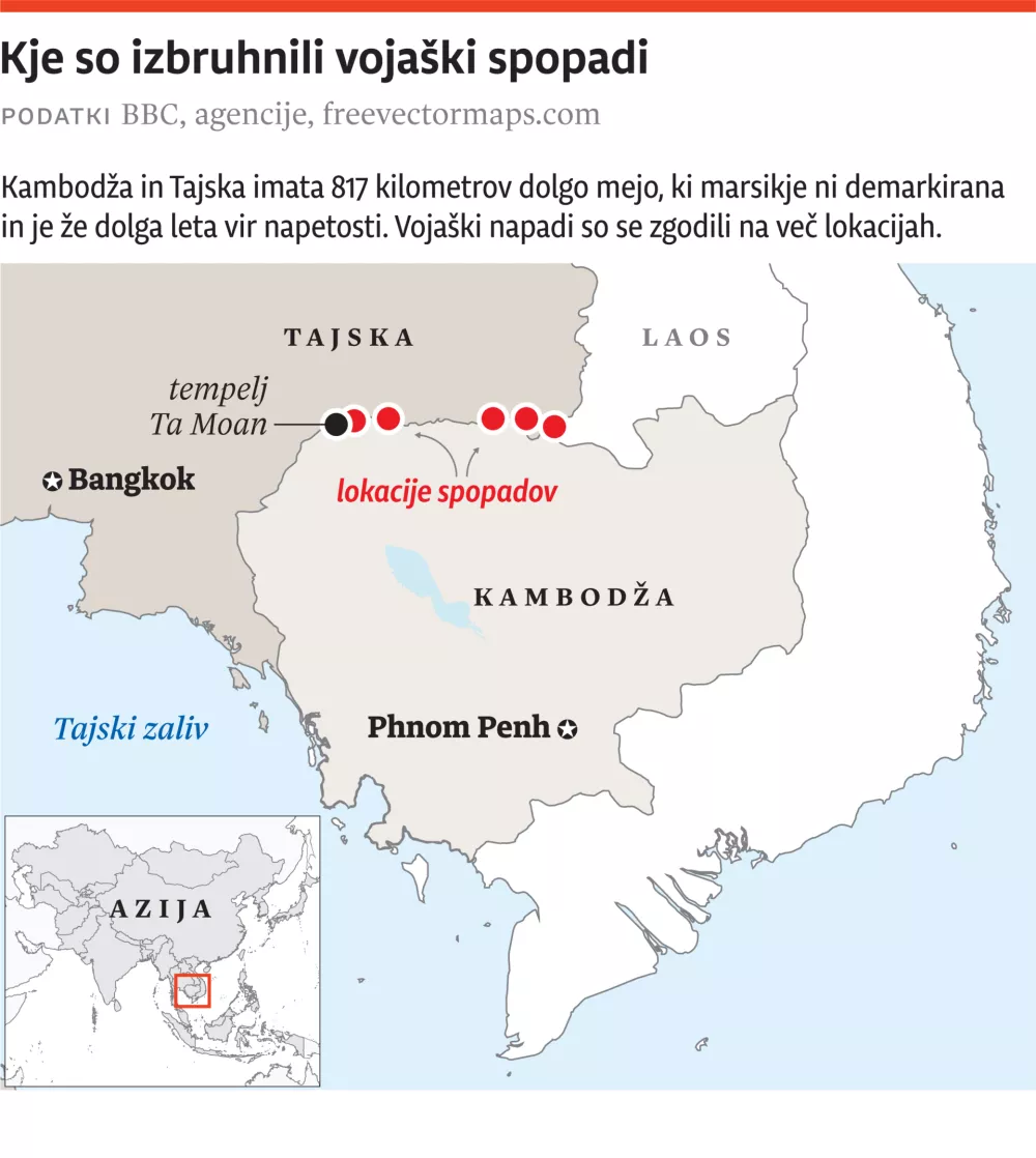 Dolgoletni mejni spor Tajske in Kambodže se je v četrtek nevarno zaostril z letalskimi in topniškimi napadi ter najmanj dvanajstimi večinoma civilnimi smrtnimi žrtvami. Tajska je razglasila zaprtje 817 kilometrov dolge meje s Kambodžo na svojem jugovzhodu, odpoklicala veleposlanika ter napovedala izgon kamboškega. Vojaške operacije so potekale na več koncih, vršilec dolžnosti tajskega premierja Phumtham Wechayachai pa je dejal, da se niso razširile drugam in da si državi nista napovedali vojne. V jugovzhodni Aziji so zaskrbljeni, države v regiji so Bangkok in Phnom Penh pozivale k umiritvi razmer.